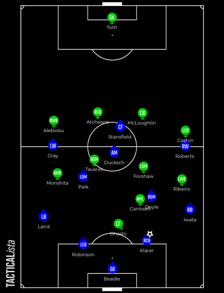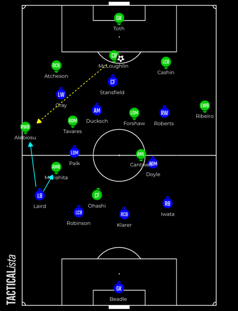 They set up in a 3-4-2-1 shape on paper but often it acts much more like a 4-4-2. The left wing-back (Yuri Ribeiro) pushes on into a left-midfield role whilst Eiran Cashin shifts over to adopt the spaces a traditional left-back would.