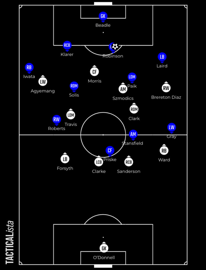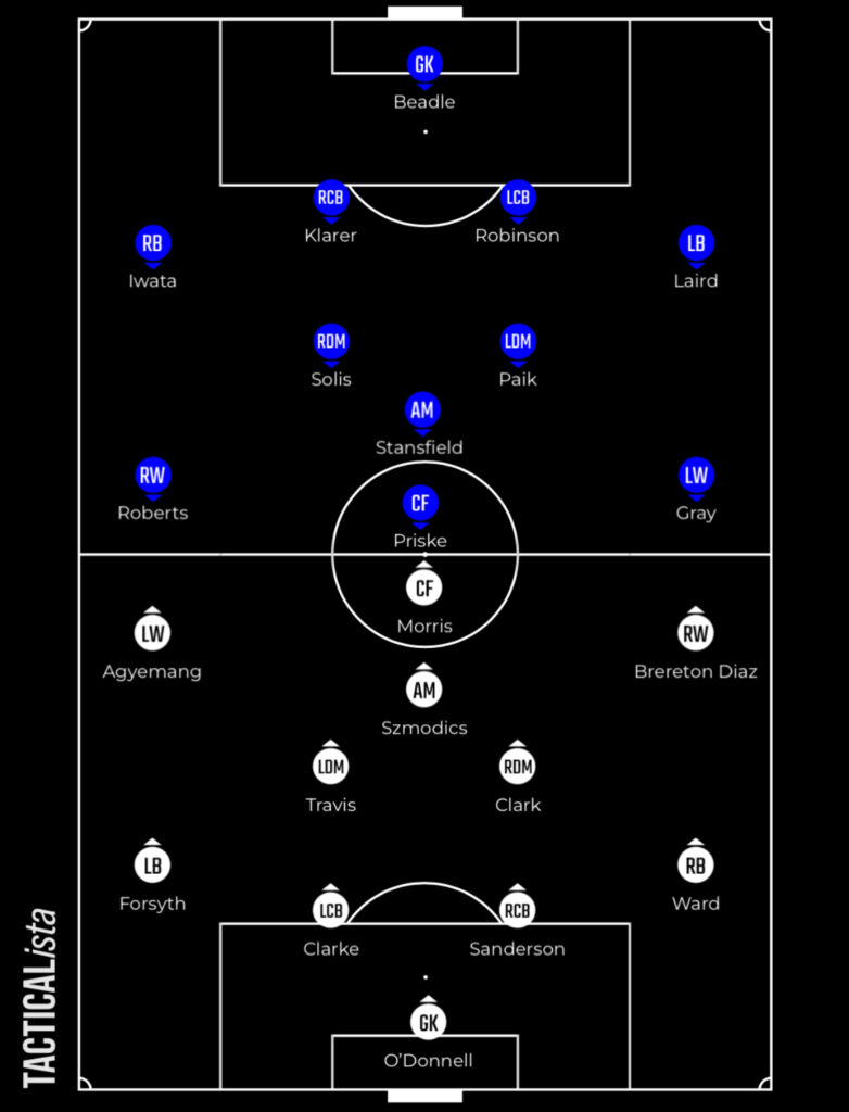 They vary how narrow or wide their forward line are depending on whether the opposition set up with a back four or five. If Blues continue with the 3-1 build up shape they’ve adopted in recent games, it’ll predominantly be Ben Brereton Diaz or Szmodics who stick to Paik Seung-Ho.