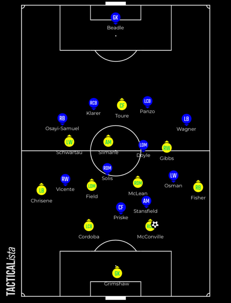 This then leaves big areas down the channels where the full-backs (Ben Chrisene and Fisher) can exploit. What’s key about this is because the players are close together they can combine quickly and move the ball across midfield in a short space of time.