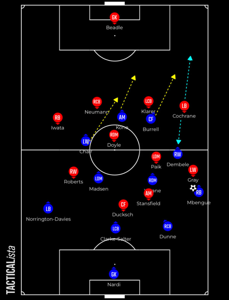 When they look to play longer they can aim for Burrell or Kone, when they start together, who are both competent at winning duels. What’s great about their longer play is that they can move the defenders around quickly and create gaps for others to attack.