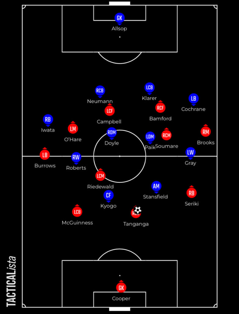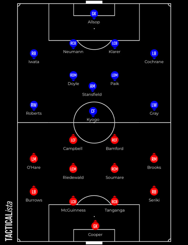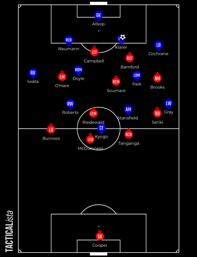 I think the energy of Kyogo could be important in applying pressure to their defenders when they get on the ball, as they’re the base of everything in front of them. If Blades can get the ball wide consistently it’ll isolate Iwata and Alex Cochrane who may struggle to stop crosses in.