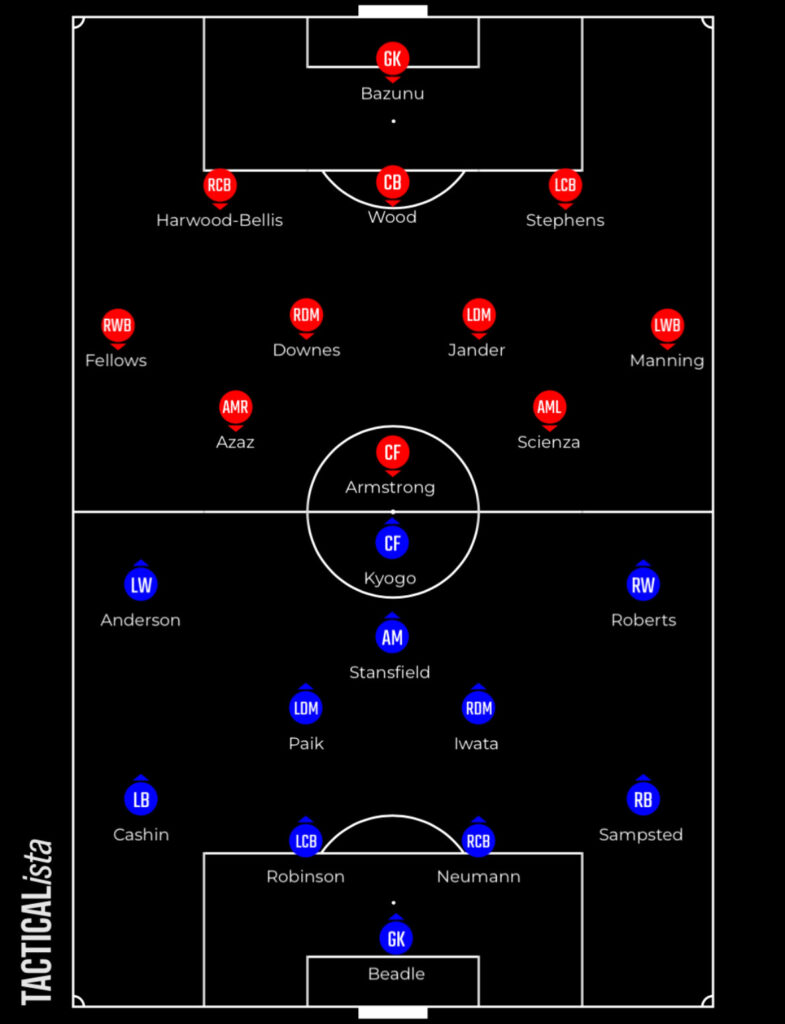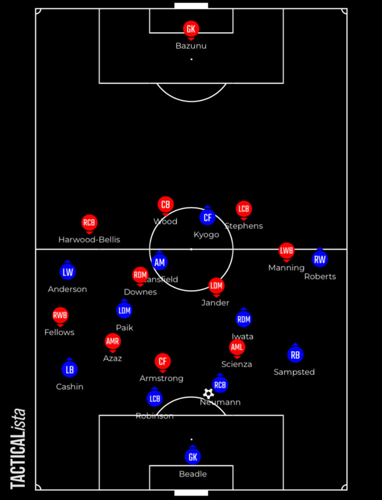 One reason I would vouch for Sampsted starting is Iwata’s lack of positional discipline was an issue. Down the Saints left Manning hugged the touchline whilst Leo Scienza sat in the pocket and Iwata got caught out trying to press Manning rather than sticking with Scienza.