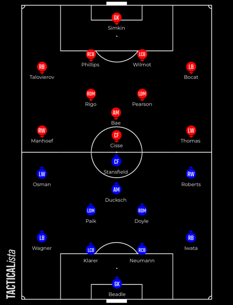 It’s certainly a dynamic front three, and could be quite fluid with Thomas and Cisse interchanging so the positional discipline of Iwata, Wagner and Neumann particularly will need to be key.