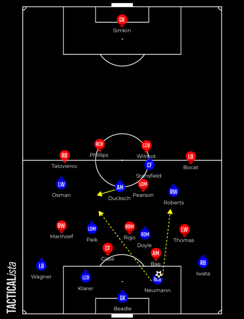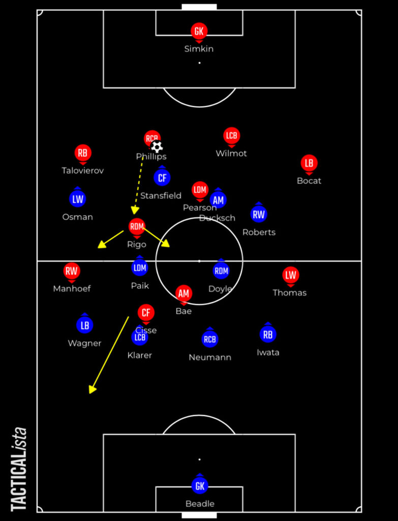 Rigo can only close one of the pivot players and therefore they need the two central pressers to cover the other with the angling of their run but if Blues can move the ball quickly, particularly down their left, then they can unlock either Paik Seung-ho or Tommy Doyle.