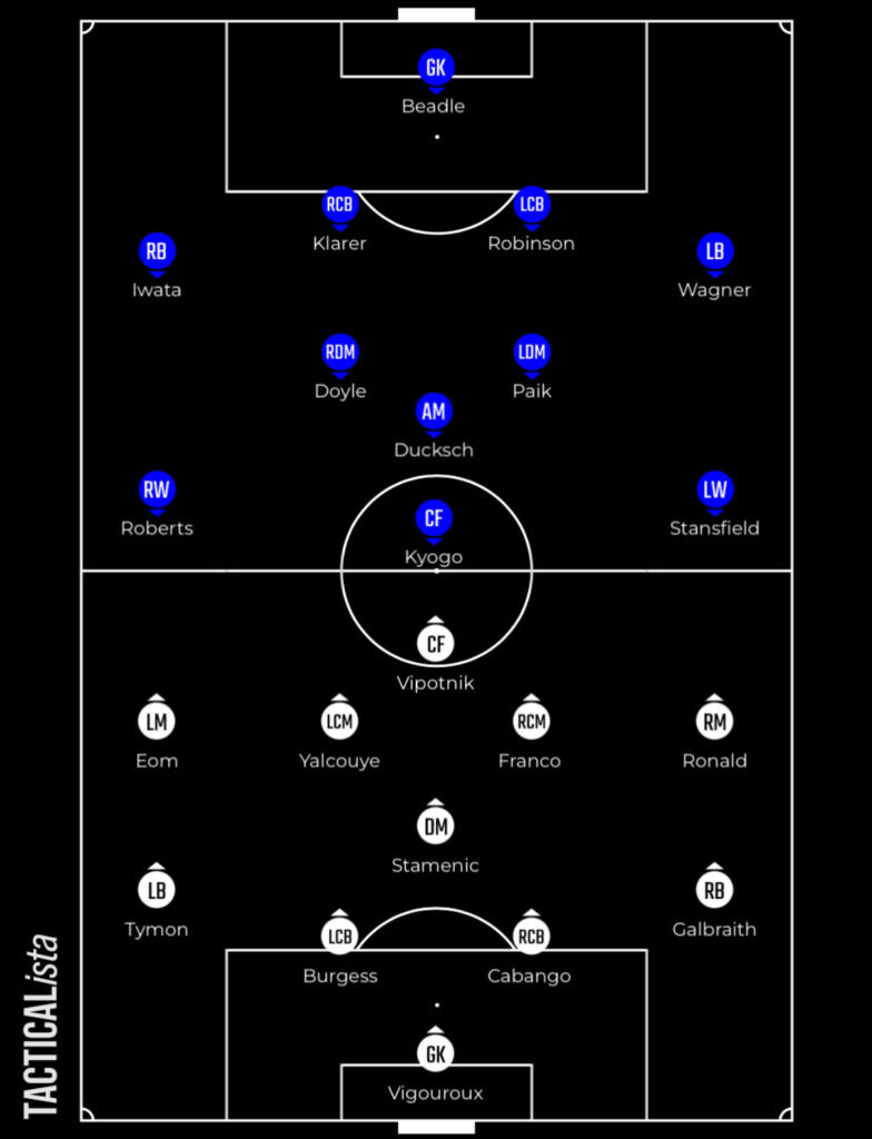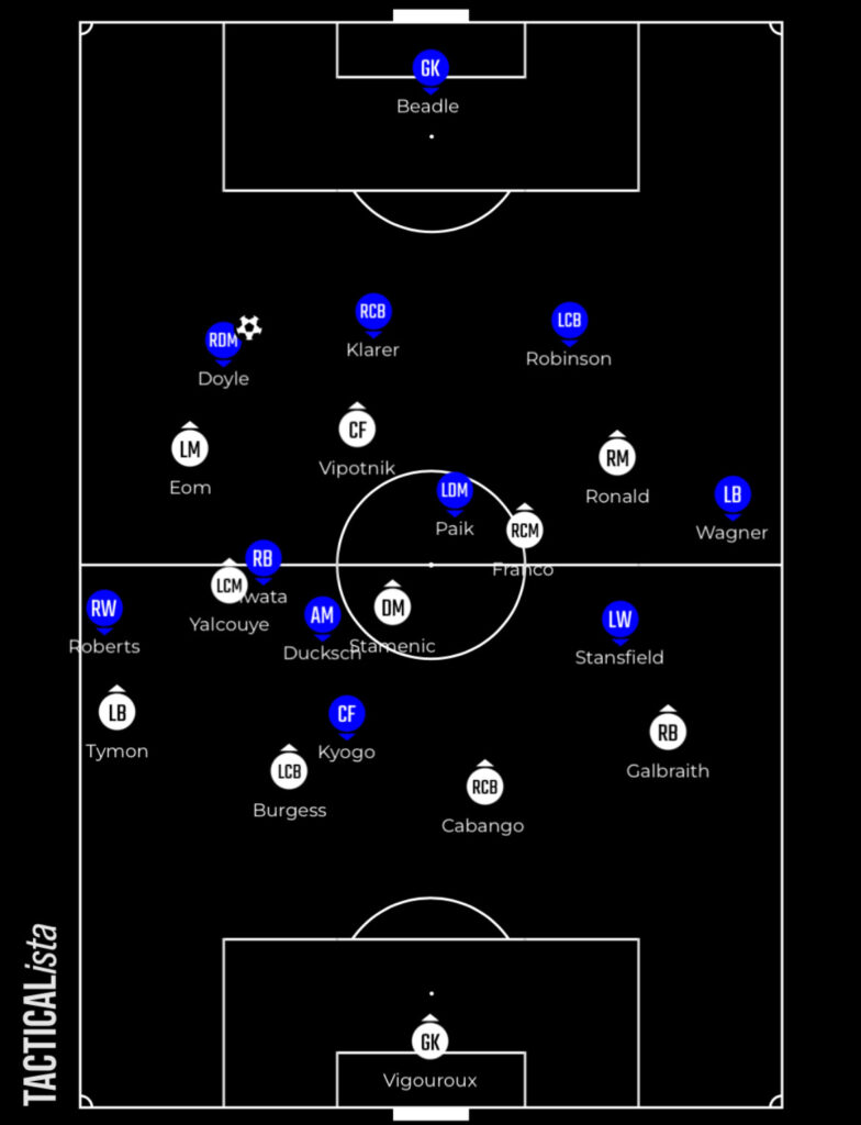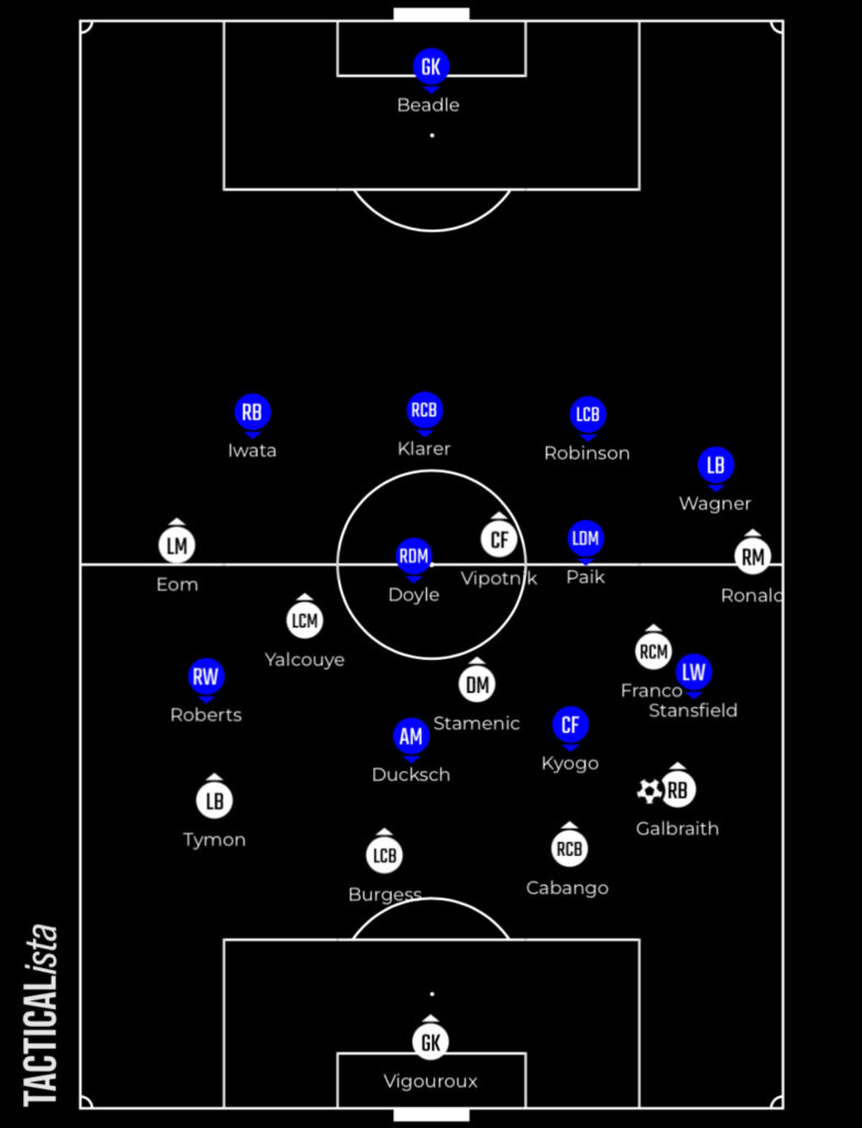 They build out with a traditional back four, with defensive midfielder Marko Stamenic dropping close to the defence to pick up the ball too. Stamenic does drop in at times and allow the full-backs to get higher and wider – where they both can benefit.