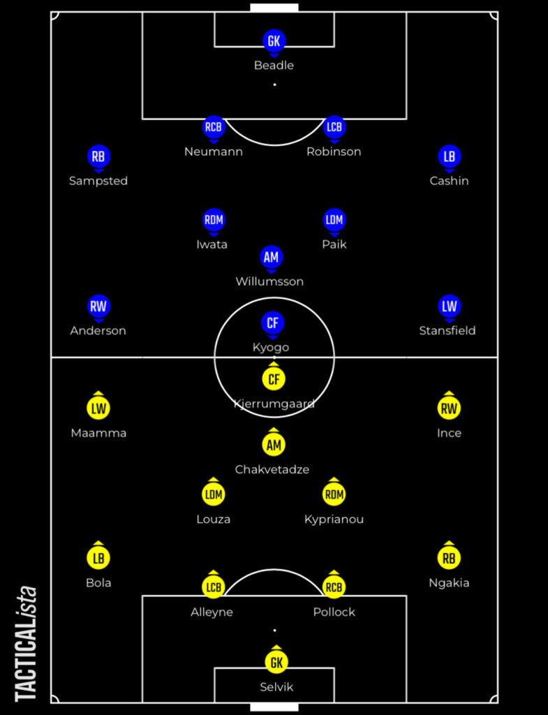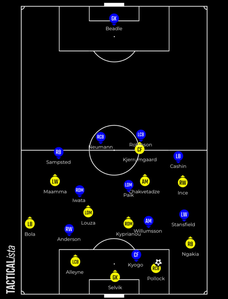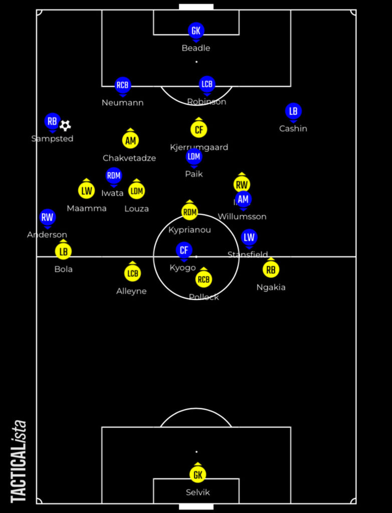 Roberts struggles to defend against proper athletic full-backs and we know Iwata’s positional discipline isn’t fantastic so perhaps Iwata in a midfield three in front of Alfons Sampsted may be a better option.